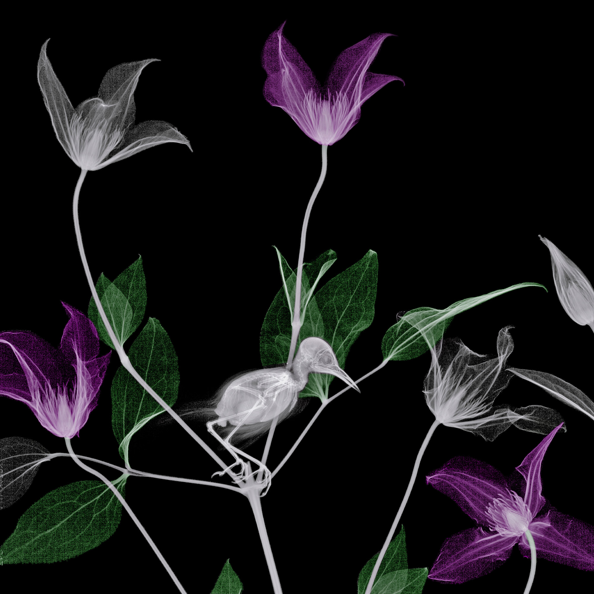 The animal is the centrepiece. Once I have a specimen, I attempt to recreate its habitat by collecting the relevant natural parts such as leaves, flowers, plants and branches. Then these components are arranged in such a way that creates a natural scene (biorama). Conventional photographs are taken and I then try to imagine what the x-ray will look like.